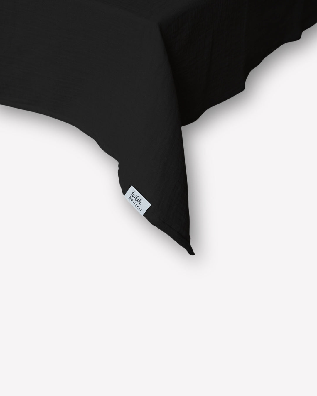 Tischlein deck dich! Unsere Musselin-Tischdecke in klassischem Schwarz ist ein Garant für einen stilvoll gedeckten Tisch – egal ob beim Mittagessen mit der Familie oder beim Abendessen mit Freunden.