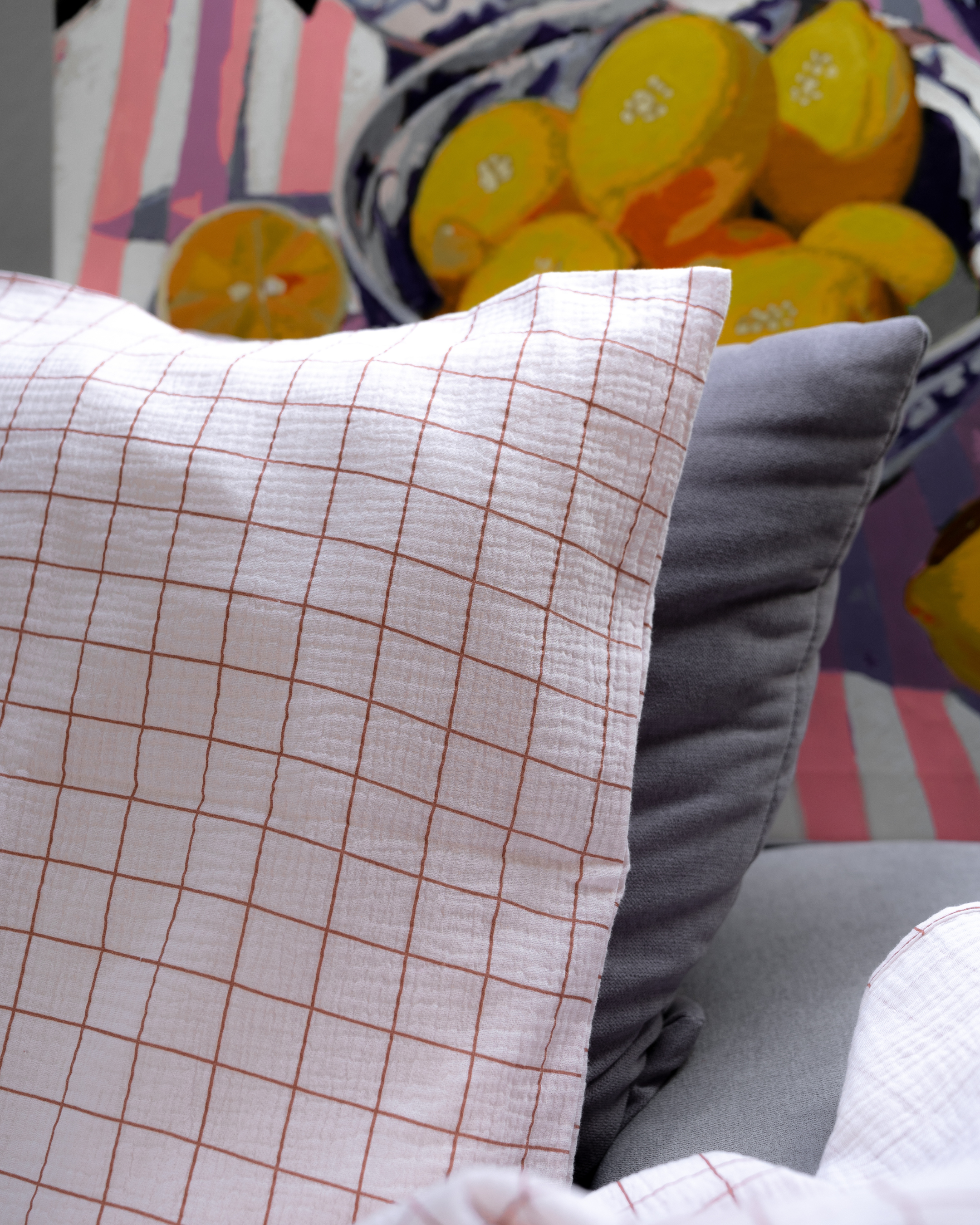 Unser Sofakissen im zarten Rosa mit altrosa Karos ist ein echtes Lieblingsstück für jedes Zuhause. Das dezente Grid Design vereint verspielte Romantik mit zeitloser Eleganz und sorgt in jeder Ecke – ob auf dem Sofa, im Sessel oder auf dem Bett – für einen liebevollen Blickfang.