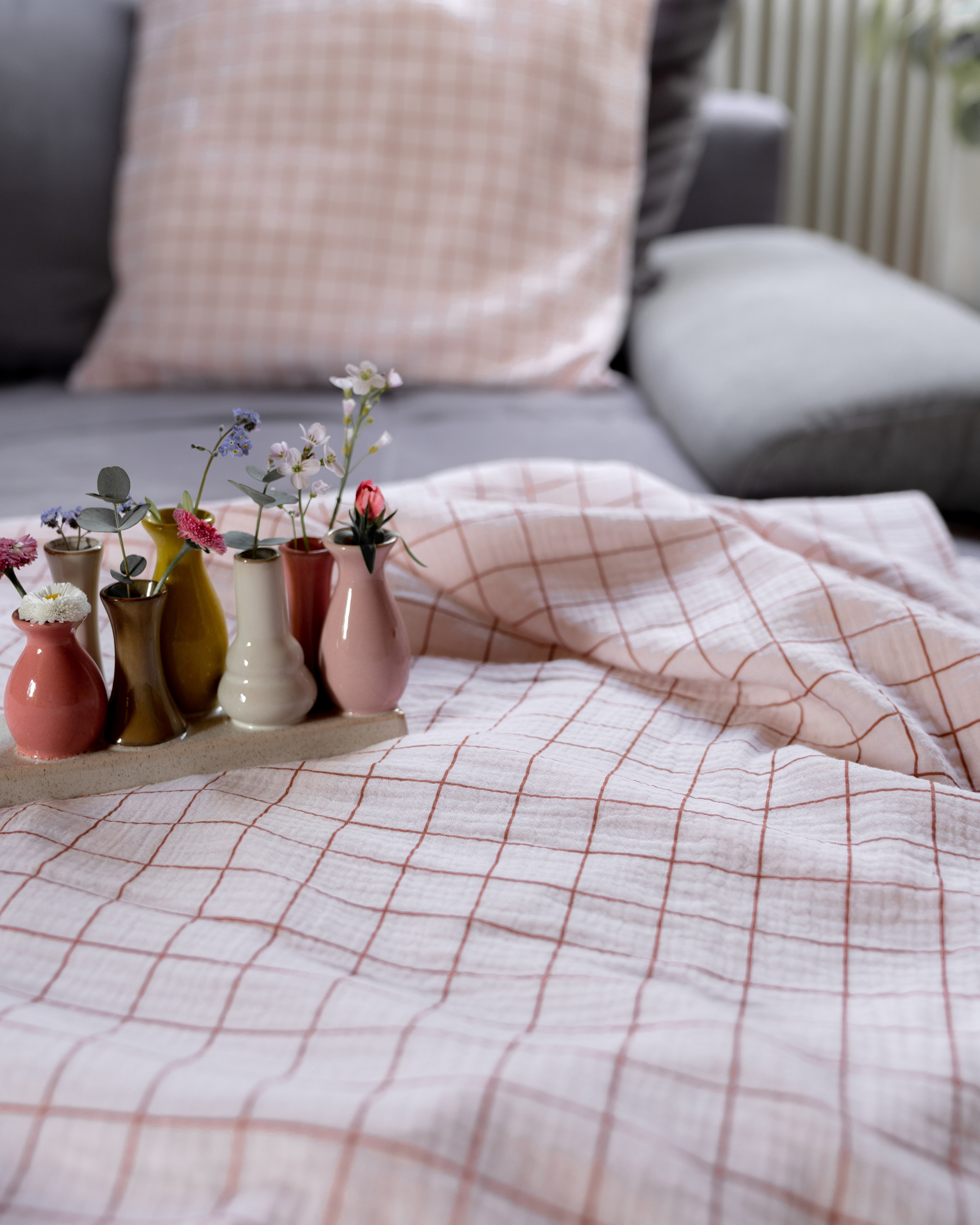 Egal ob Sofadecke, Sofakissen oder unsere leichte Sommerdecke: Musselin ist ein absoluter Hingucker in Deinem Zuhause. Dabei sind unsere Produkte auch vielseitig einsetzbar: auf der Couch, im Garten oder sogar im Sommer als leichte Bettdecke.