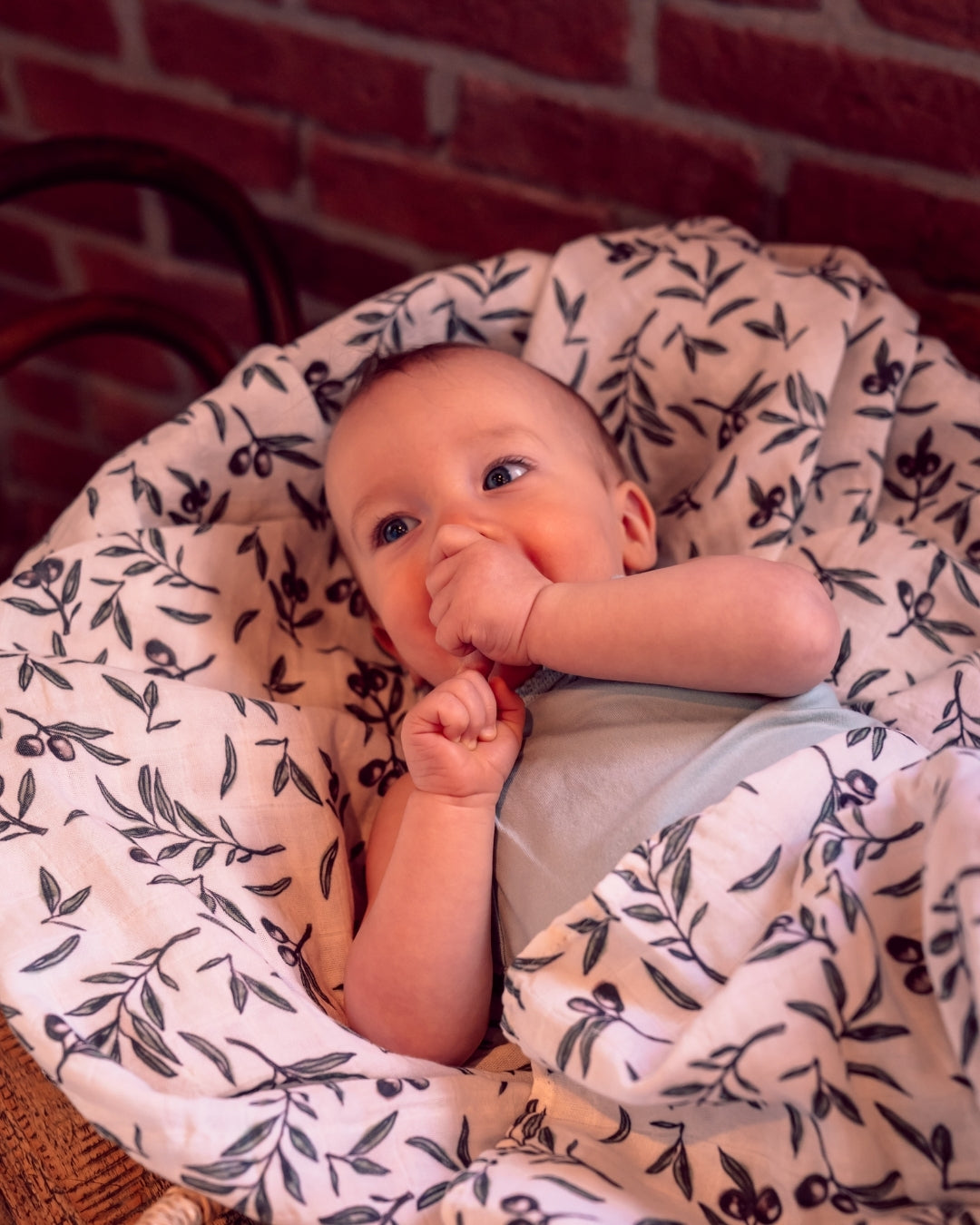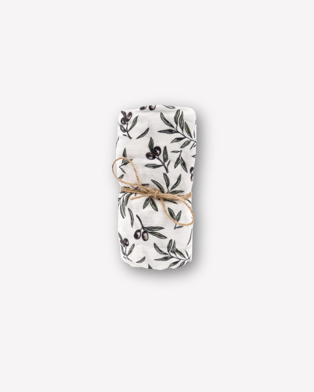 Tiefhängende Olivenzweige, durch die eine warme Brise weht und die schwarz glänzenden Oliven zum Schaukeln bringt. Unser Mulltuch Olive Garden aus der Dolce Vita Kollektion fängt die romantische Kulisse eines Olivenhains ein, umgesetzt in ein dezentes, botanisches Design. Unsere Mulltücher sind ein ideales Geschenk zur Babyparty oder Geburt.