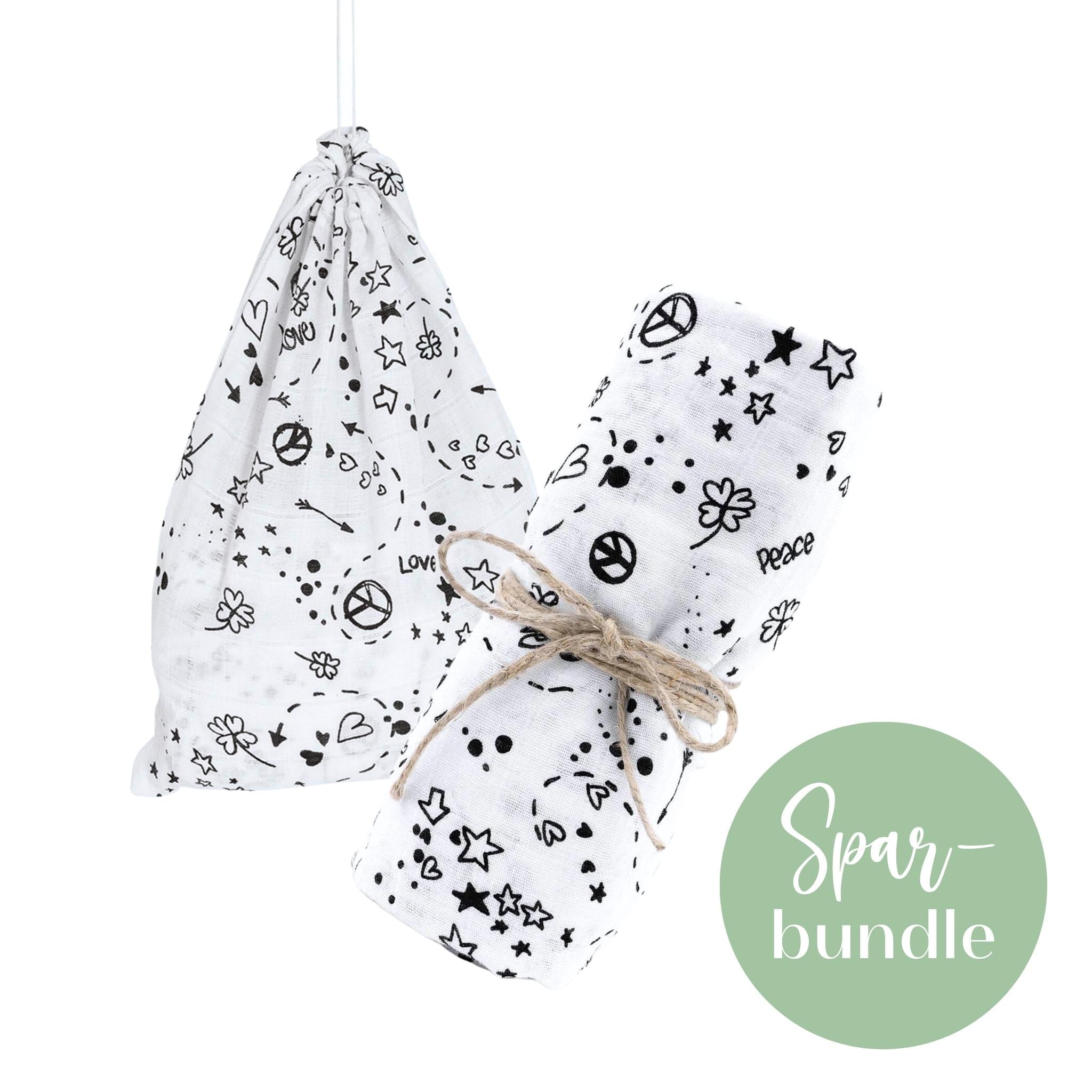 Unser Love&Peace Mulltuch Bundle gehört zu jeder Erstausstattung und ist das ideale Geschenk zur Geburt.