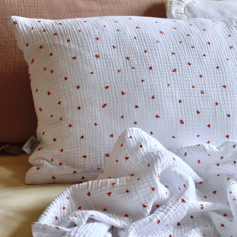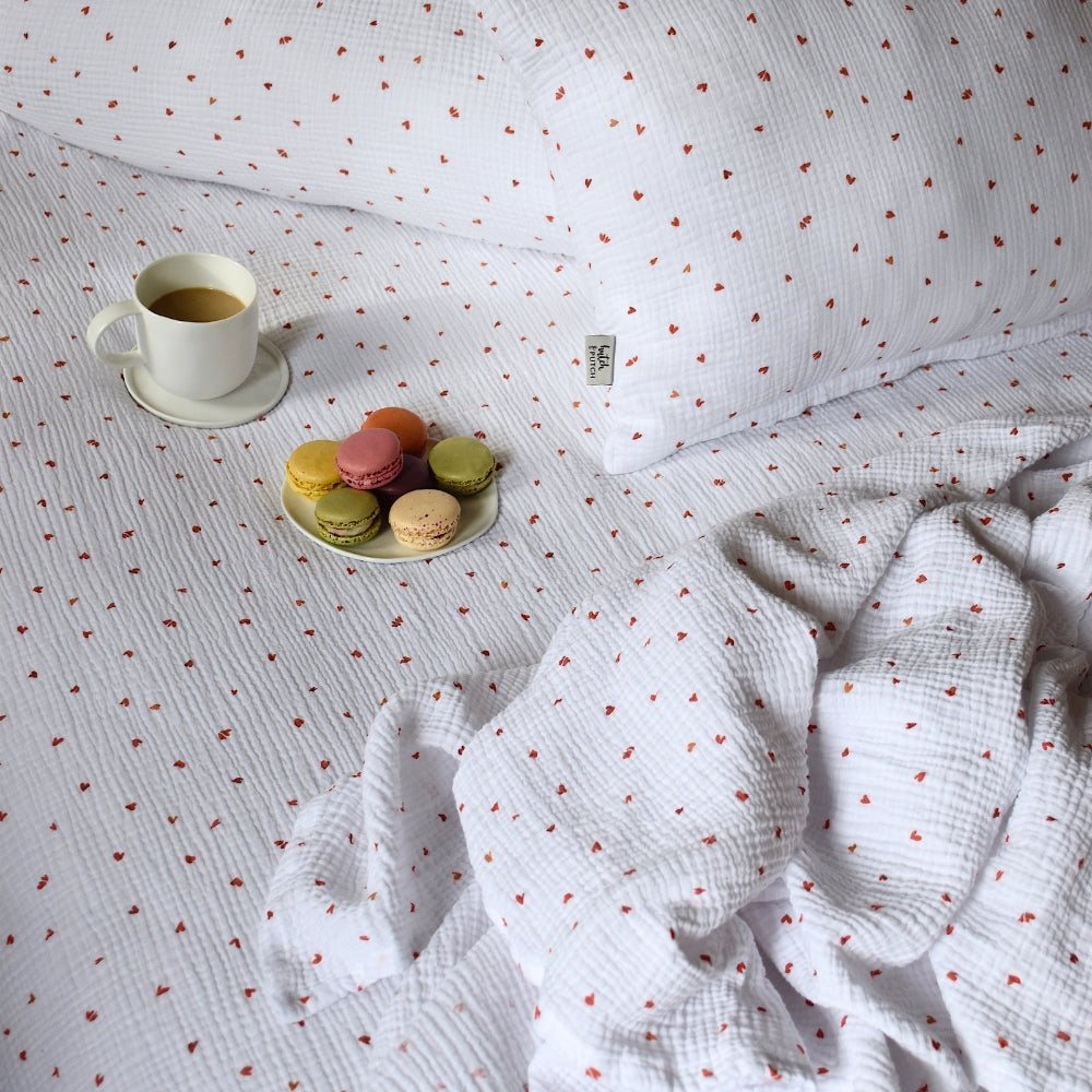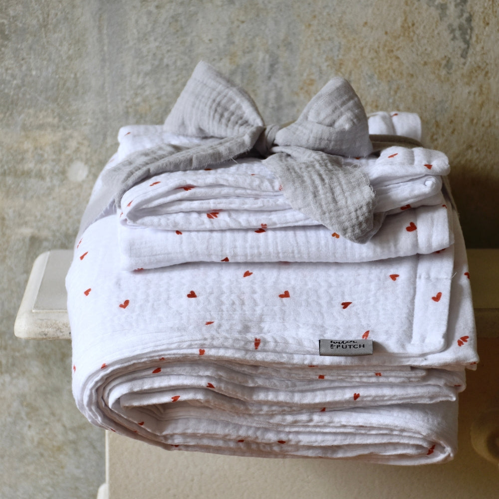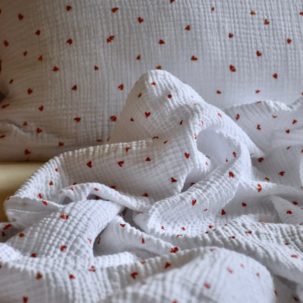 Mit unserem limitierten Herzchendesign Little Love lassen wir romantische Herzen höher schlagen. Der kuschelweiche Musselinstoff aus 100% Bio-Baumwolle in strahlendem Weiß wird von zarten roten Herzchen geziert – ein verspieltes Design, das pure Freude ausstrahlt.