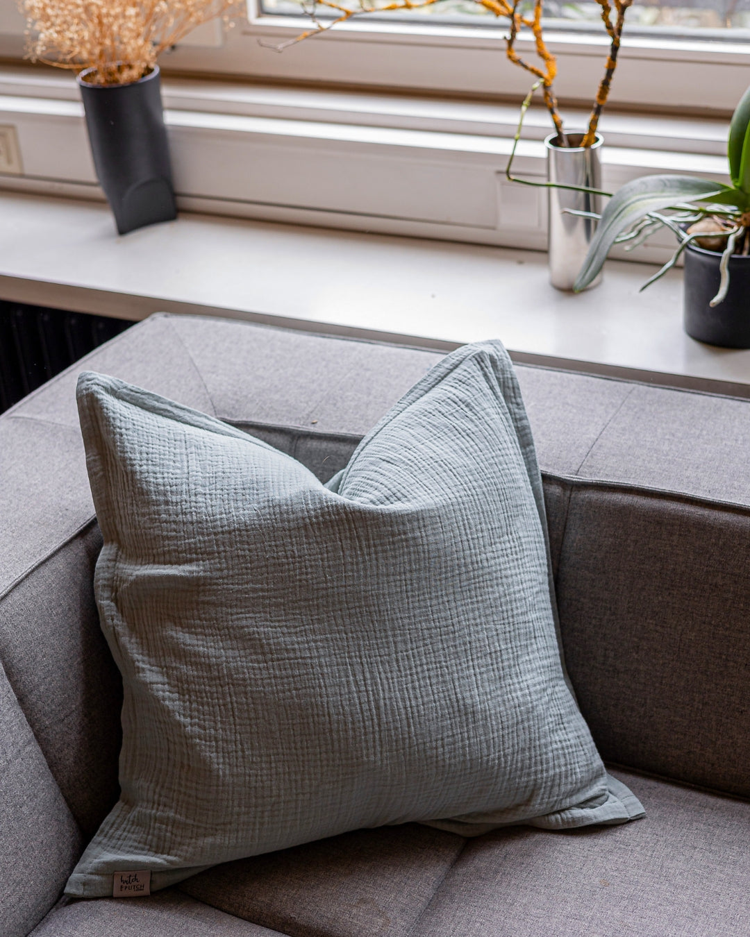 Unser Musselin Sofakissen in Aquamarine, ein frischer und sanfter Blauton mit Grünanteil aus der Mother Earth Kollektion, macht einfach überall eine gute Figur! Egal ob auf dem Sofa, im Sessel oder im Bett – es ist ein garantierter Blickfang und immer ein Kompliment wert!