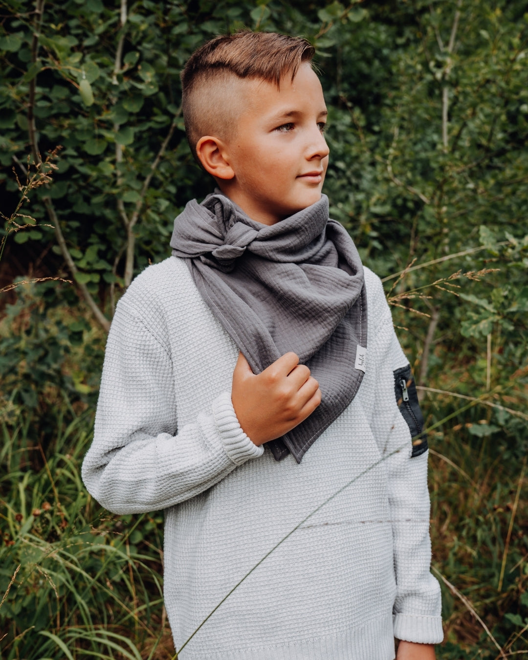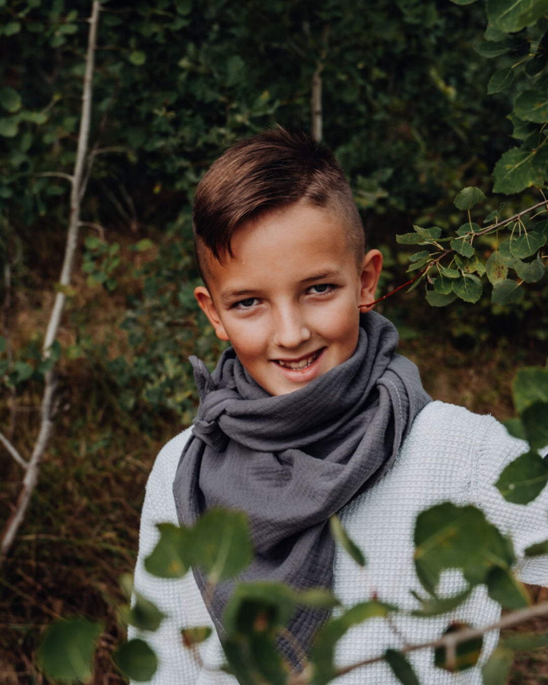 Dense wafts of fog drift over the mighty mountain peaks, the air is clear and cold. That Children's muslin scarf in Anthracite, a timeless shade of gray from the collection Nordic Aesthetics, imagine the mountainous landscape of Norway or the stony coasts of Sweden.