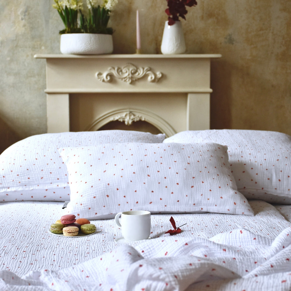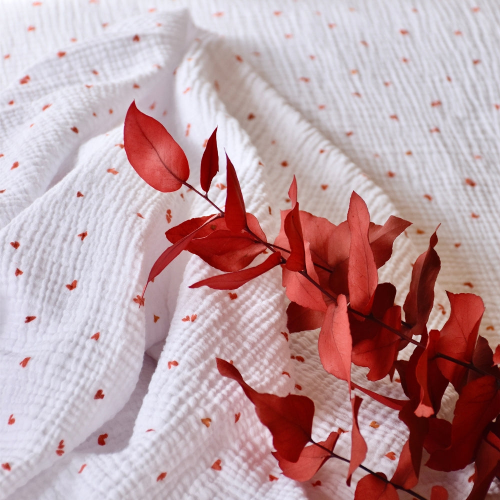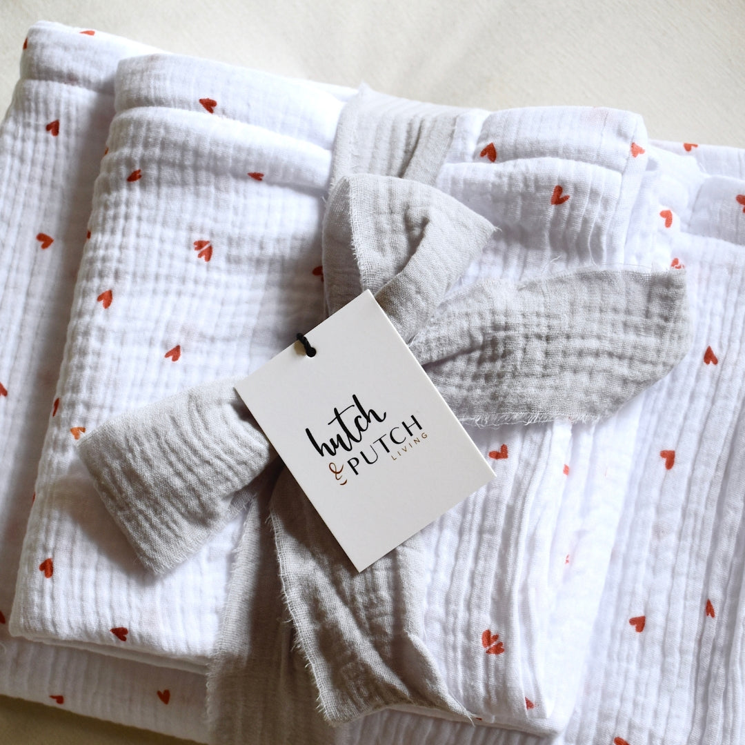 Mit unserem limitierten Herzchendesign Little Love lassen wir romantische Herzen höher schlagen. Der kuschelweiche Musselinstoff aus 100% Bio-Baumwolle in strahlendem Weiß wird von zarten roten Herzchen geziert – ein verspieltes Design, das pure Freude ausstrahlt.
