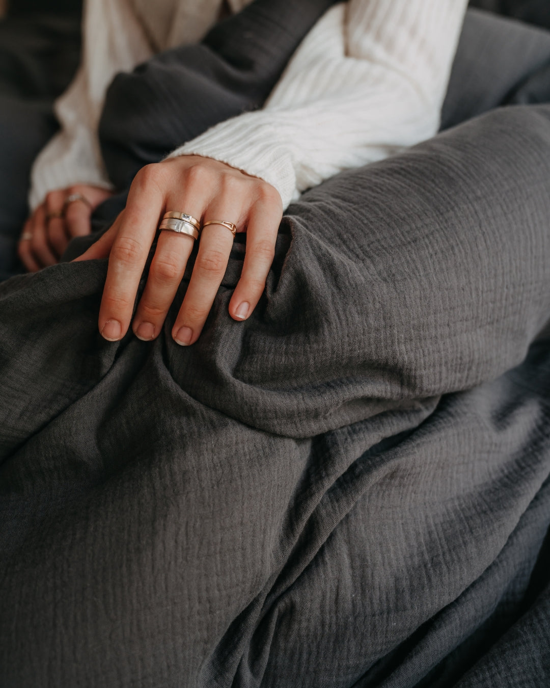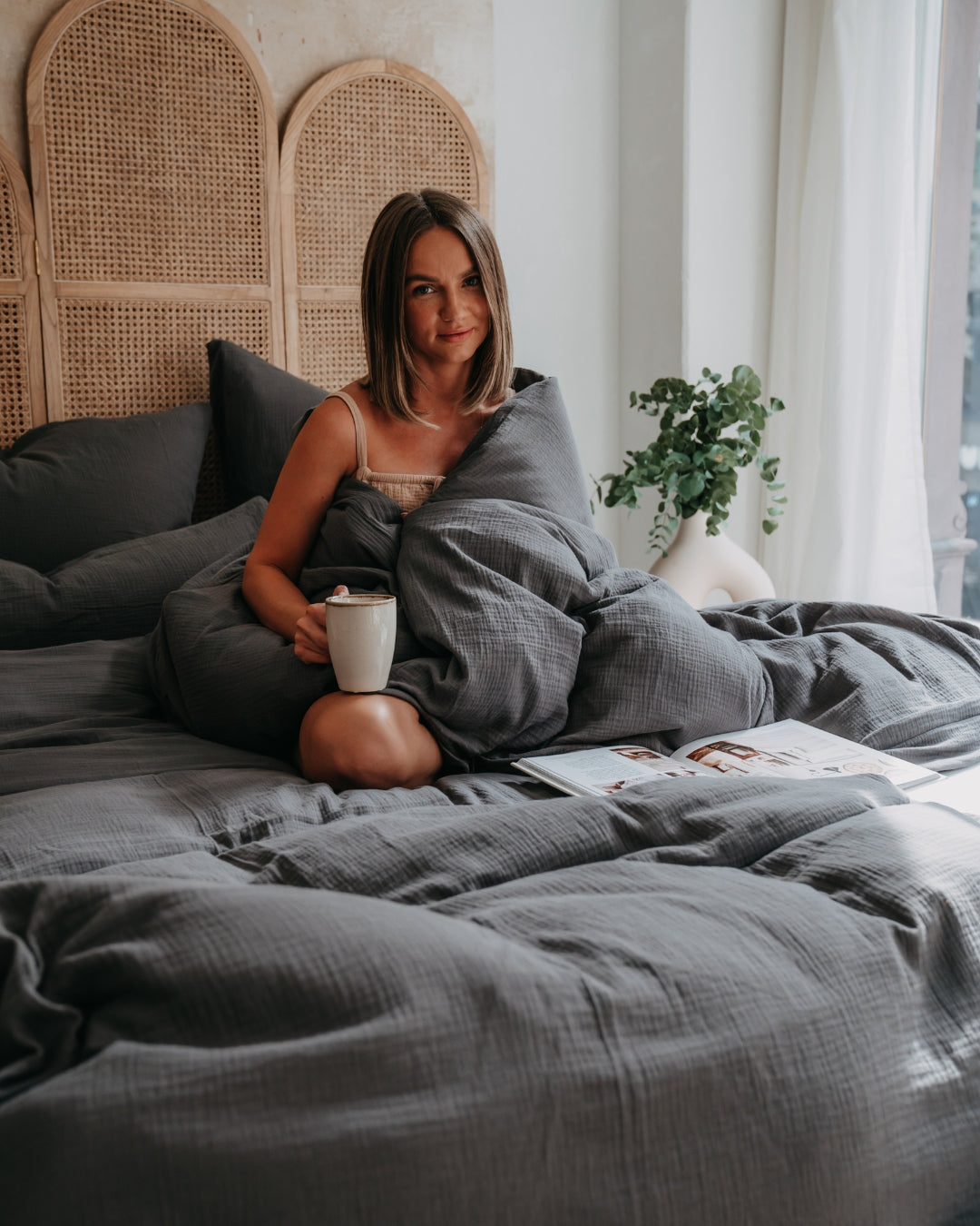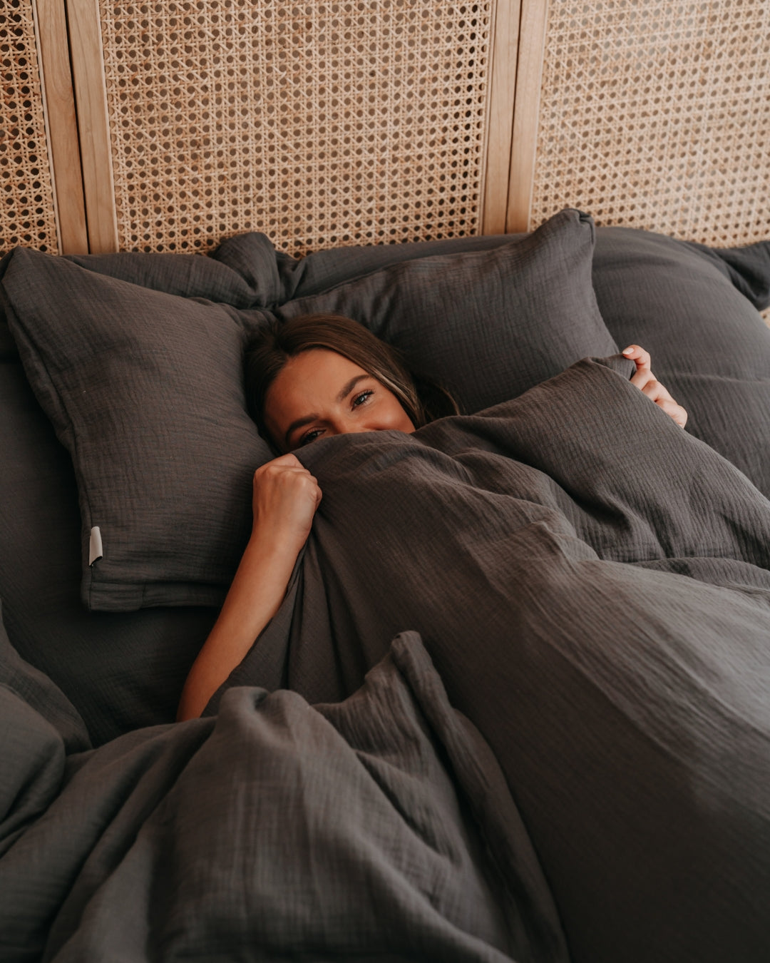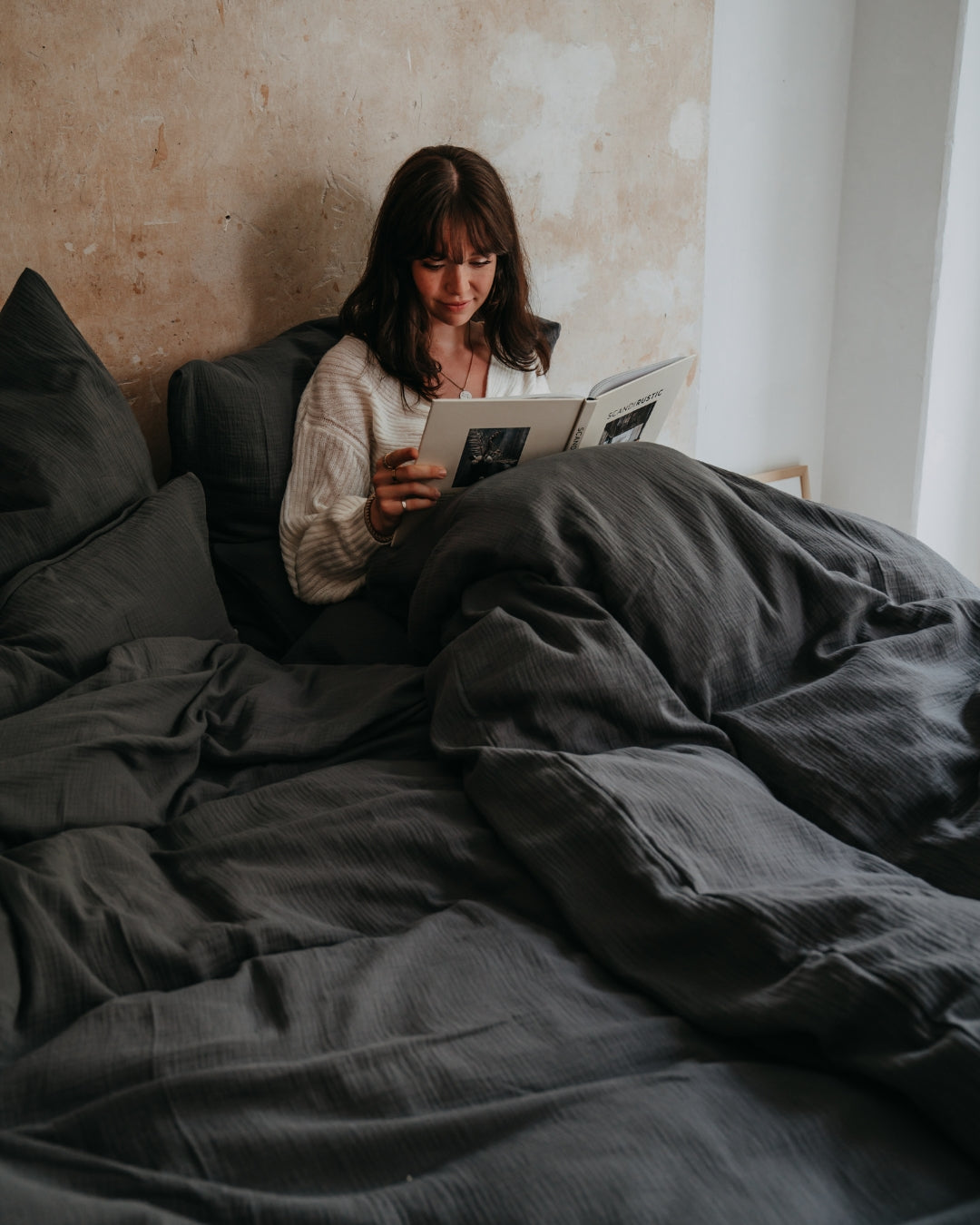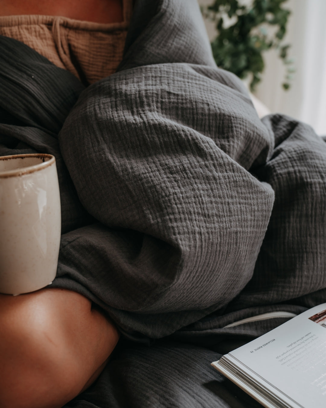 Have you always wanted to sleep like on clouds? In our cozy and stylish muslin bed linen you will dream of a heavenly sleep night after night. Sleeping in and relaxing has never been so tempting. It doesn't matter whether you snuggle up under the covers in the evening or enjoy Sunday brunch in bed - you feel safe and at home in our muslin bed linen! Suitable for every season, because thanks to the temperature-regulating properties of muslin, our bed linen cools you down in summer and keeps you cozy and warm in winter.Versand