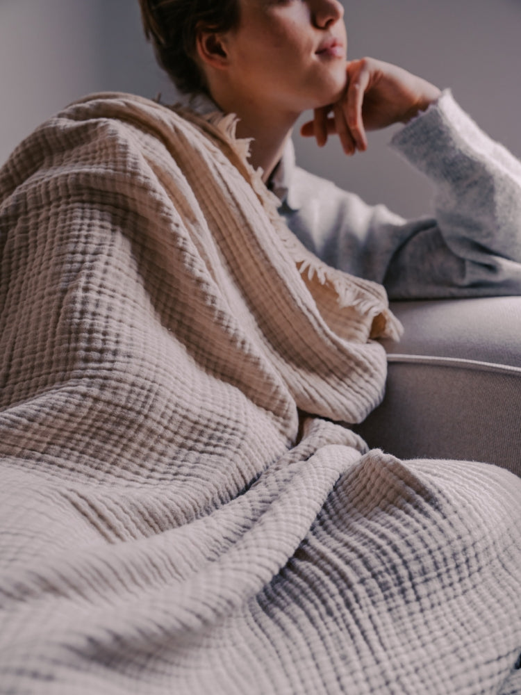 Our muslin sofa blanket ensures extra cozy movie nights or particularly comfortable reading hours on the couch. The highlight of the blanket is its stylish fringes, which give every living room a stylish update.