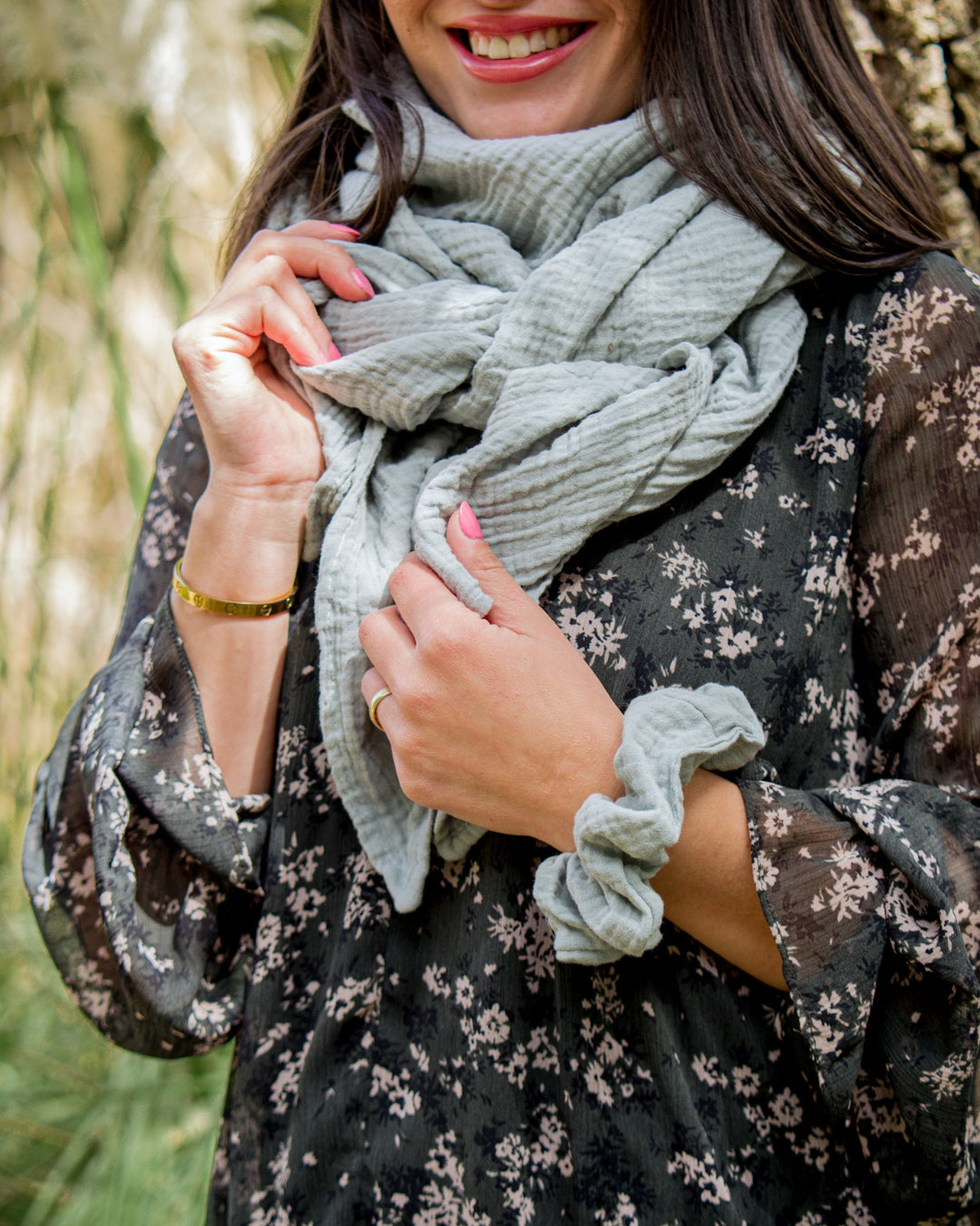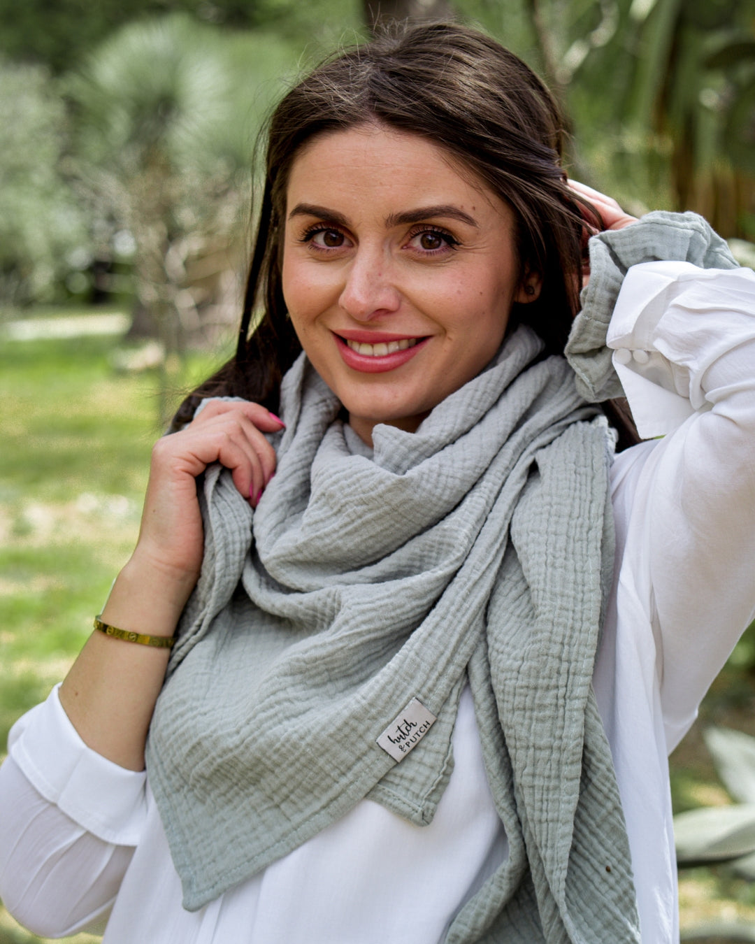 The color Aquamarine ours Mother Earth Collection represents a clear mountain air with which we find calming and peace through deep breaths. Our Aquamarine muslin scarf for adults, a fresh and soft shade whose serene and meditative energy brings you rest and tranquility, is a perfect match for everyone Boho-Outfit for the summer. For adults and teens aged 14 and over.