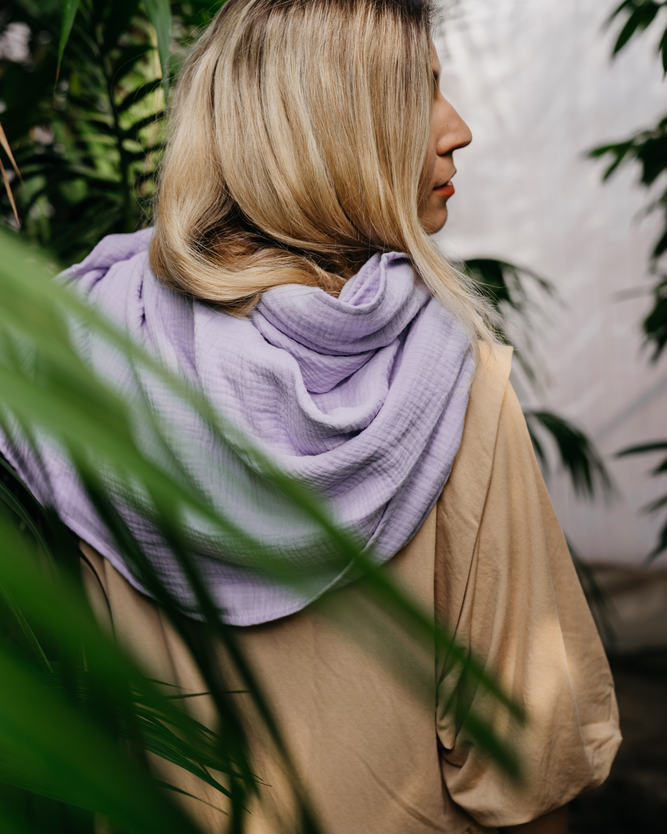 Der zarte Lavendelton wirkt beruhigend und bringt eine angenehme Leichtigkeit in deinen Alltag. Unser 100% Musselin Bio-Baumwoll Stoff fühlt sich luftig und angenehm kühl auf der Haut an – ideal für den Frühling, den Sommer oder als sanftes Layering-Piece im Herbst.