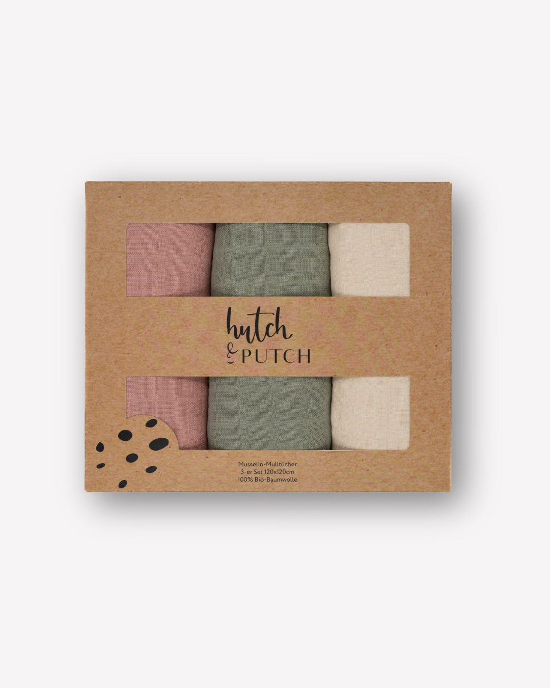 Unsere beliebten Mulltücher gibt es jetzt auch endlich einfarbig! Im praktischen 3er-Set sind folgende Farben enthalten: Cremeweiß, Salbeigrün und Rosa.