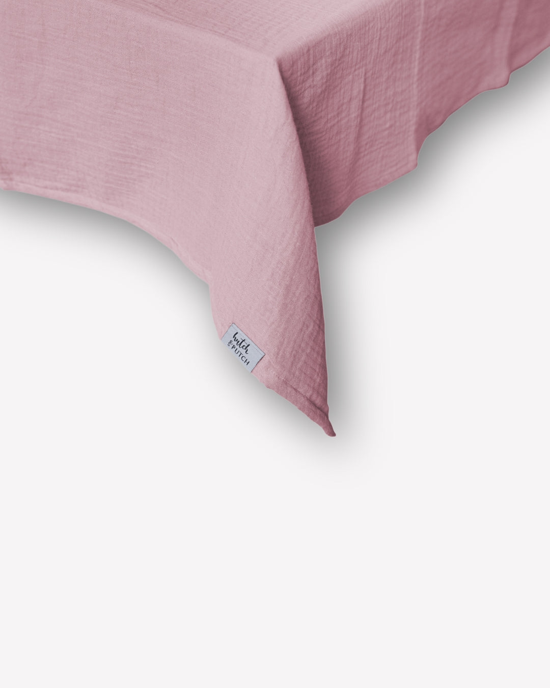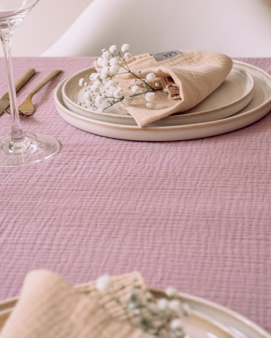 Tischlein deck dich! Unsere Musselin-Tischdecke in stilvollem Mauve ist ein Garant für einen stilvoll gedeckten Tisch – egal ob beim Mittagessen mit der Familie oder beim Abendessen mit Freunden.