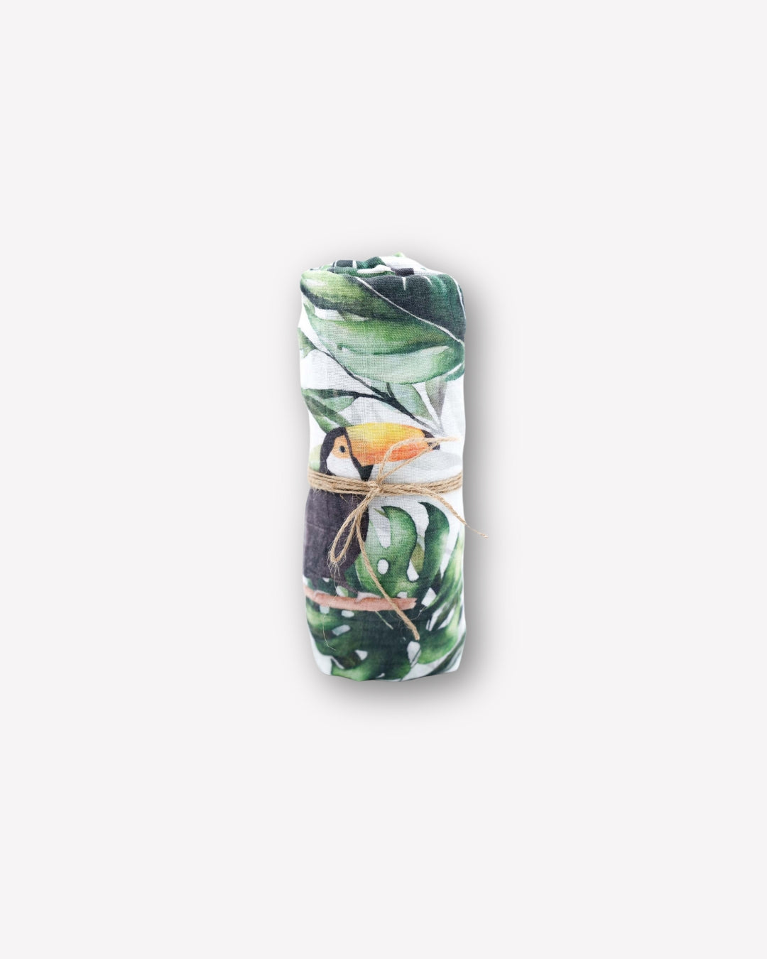 Das Mulltuch Tukan aus unserer Wildlife Kollektion bringt das Jungle Feeling direkt zu dir nach Hause. Der exotische Tukan wird umsäumt von ausdrucksstarken Monsterablättern und versprüht ein Gefühl von Abenteuer und Fernweh. Unsere Mulltücher sind ein ideales Geschenk zur Babyparty oder Geburt.