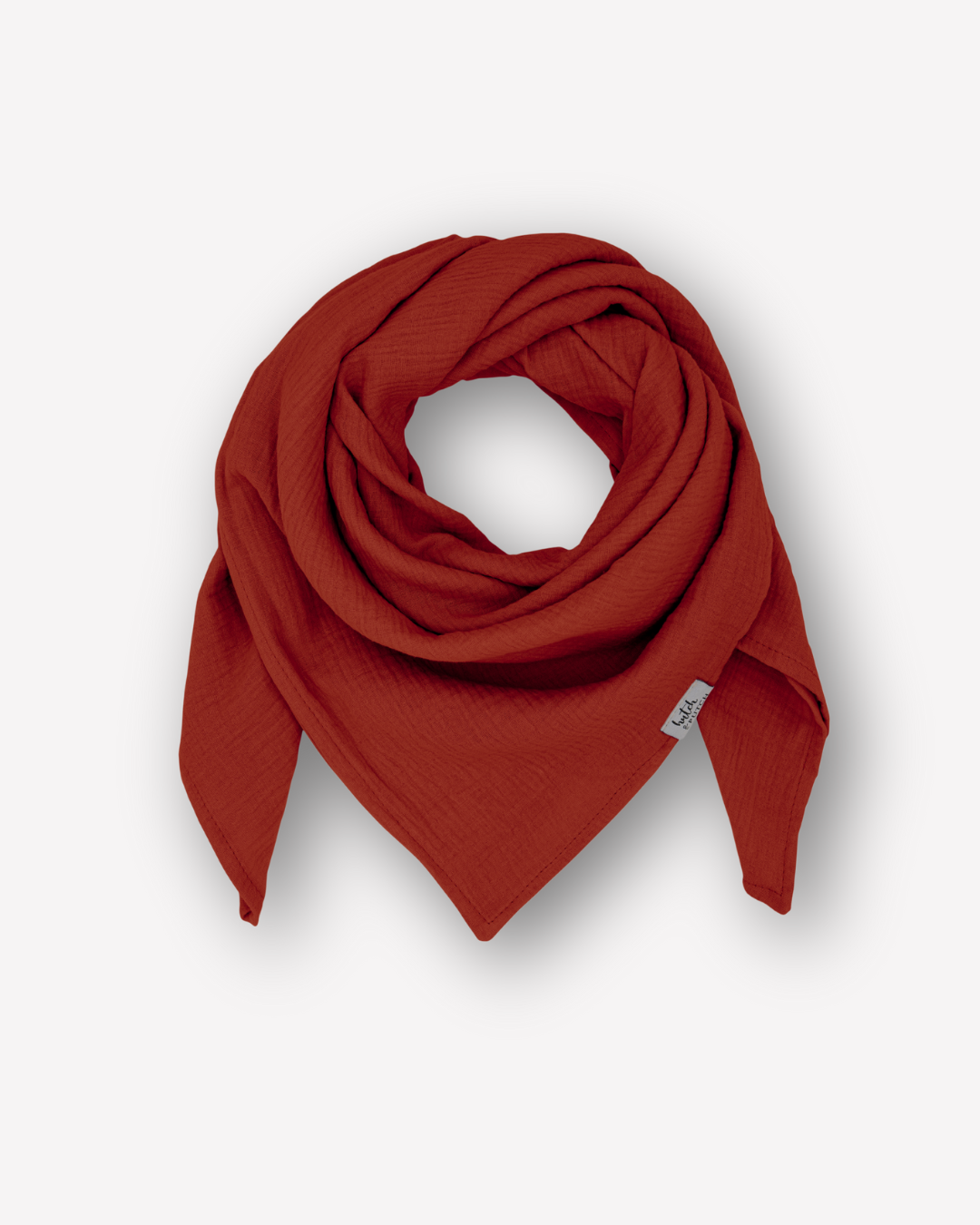 Das tiefe, warme Kupferrot fängt die Stimmung eines goldenen Herbsttages ein. Inspiriert von leuchtendem Ahornlaub, reifen Hagebutten und dem Schimmer von Kupfer im Sonnenlicht, ist dieses Musselin-Halstuch aus 100 % Bio-Baumwolle ein zeitloser Begleiter.
