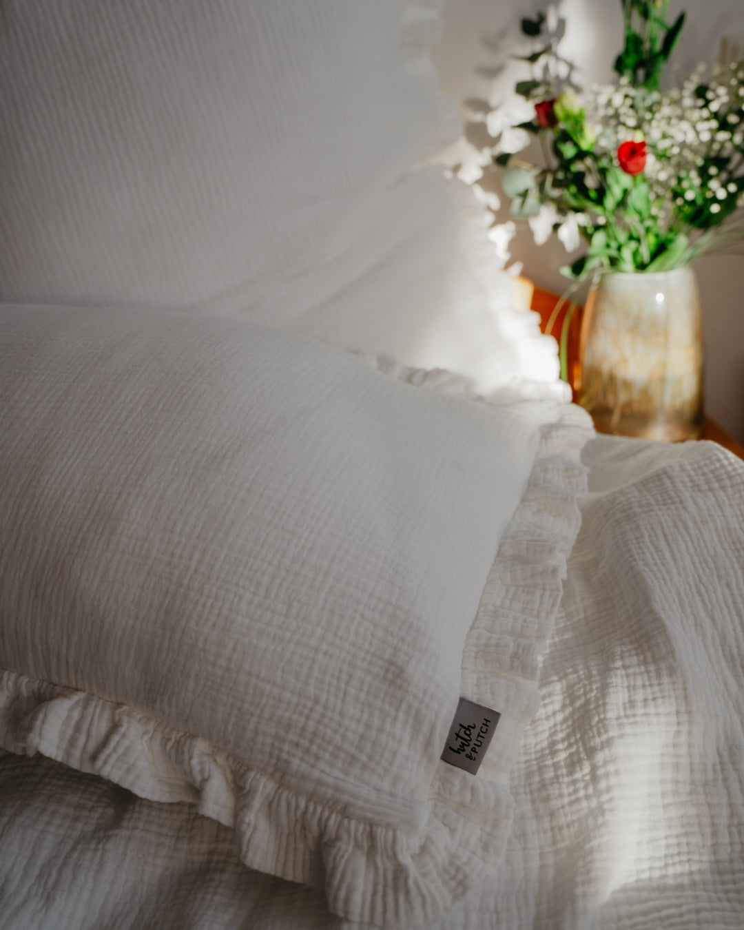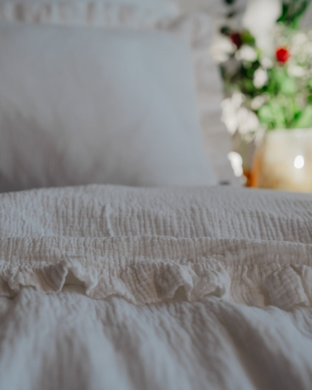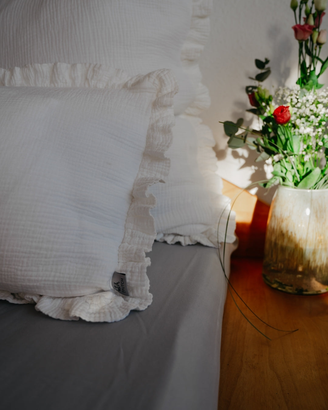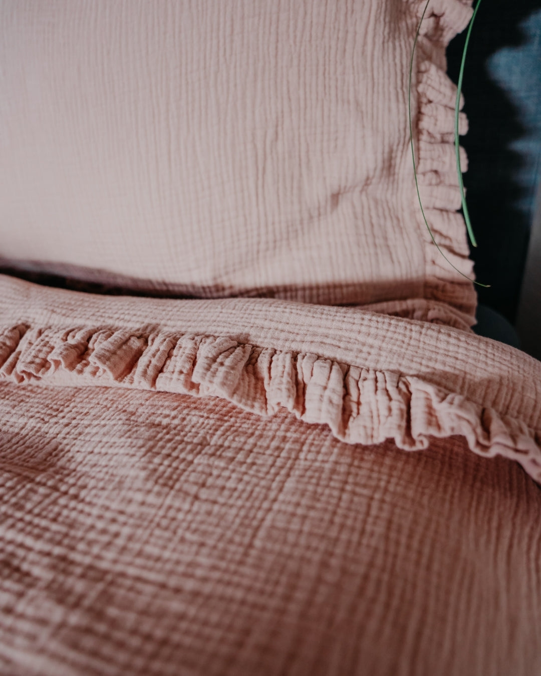 Tauche ein in himmlische Träume mit unserer Musselin Rüschenbettwäsche, die Deinem Schlafzimmer einen Hauch von Romantik verleiht. Die zarten Rüschen machen sie zur verspielten Alternative zu unserer klassischen Musselin-Bettwäsche – perfekt für alle, die sich ein gemütliches und verträumtes Ambiente wünschen.