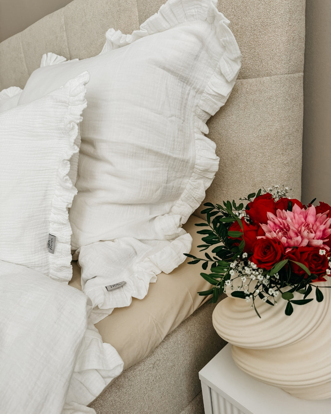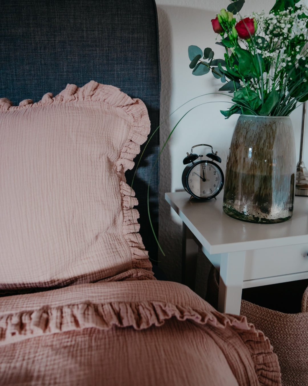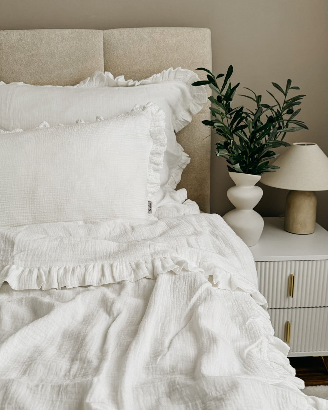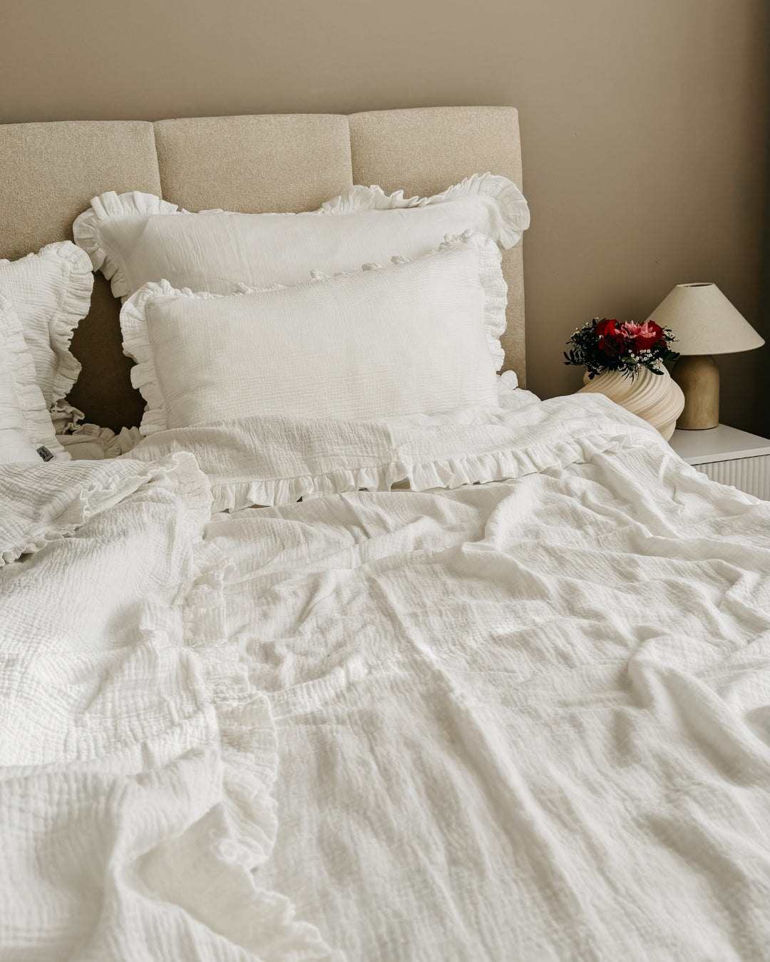Tauche ein in himmlische Träume mit unserer Musselin Rüschenbettwäsche, die Deinem Schlafzimmer einen Hauch von Romantik verleiht. Die zarten Rüschen machen sie zur verspielten Alternative zu unserer klassischen Musselin-Bettwäsche – perfekt für alle, die sich ein gemütliches und verträumtes Ambiente wünschen.
