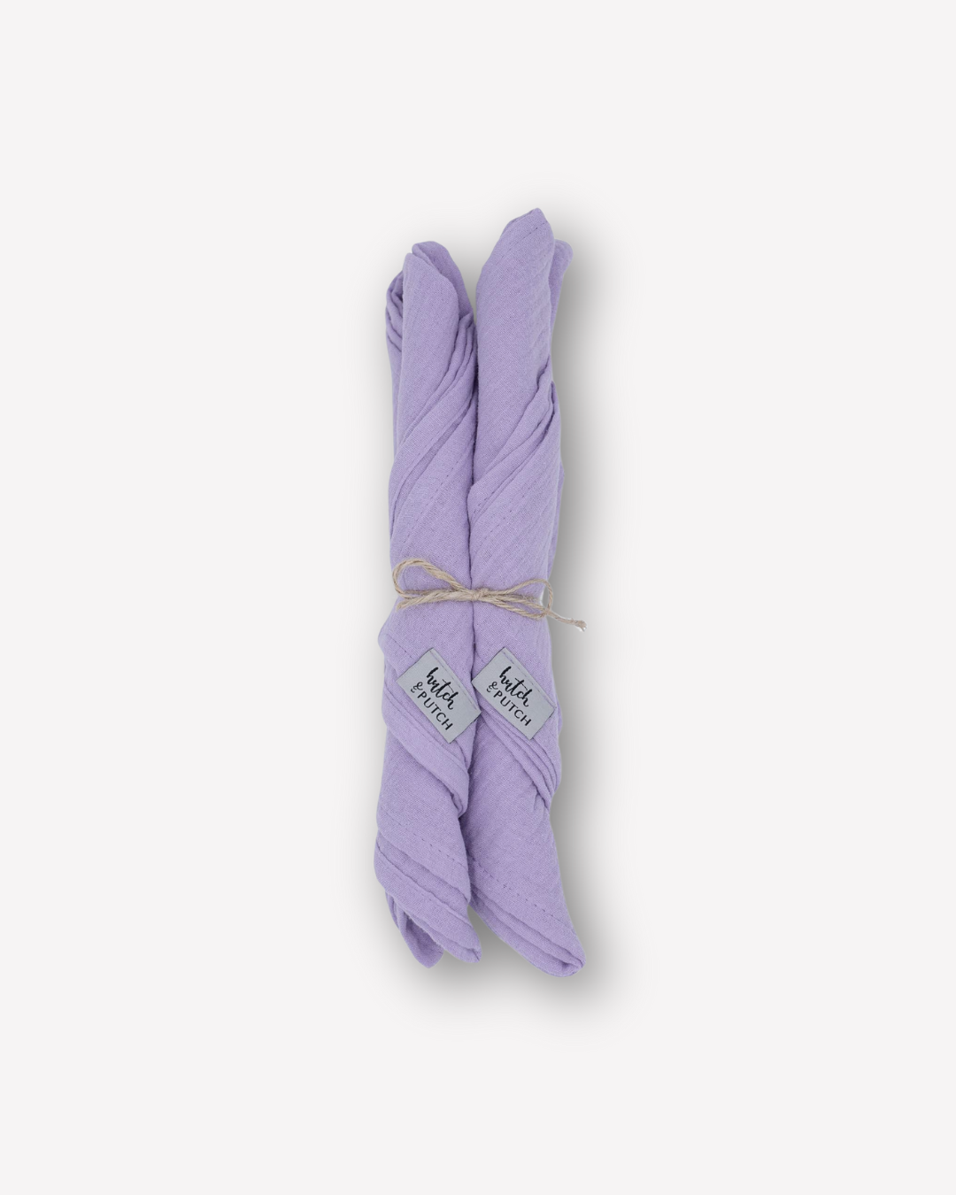 Tischlein deck dich! Unsere Musselin-Servietten in angenehmen Lavendel sind ein Garant für einen stilvoll gedeckten Tisch – egal ob beim Mittagessen mit der Familie oder beim Abendessen mit Freunden.