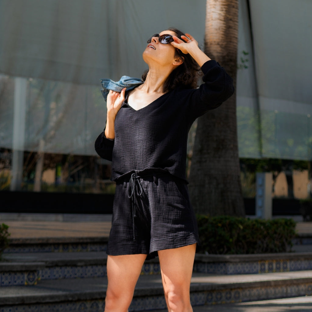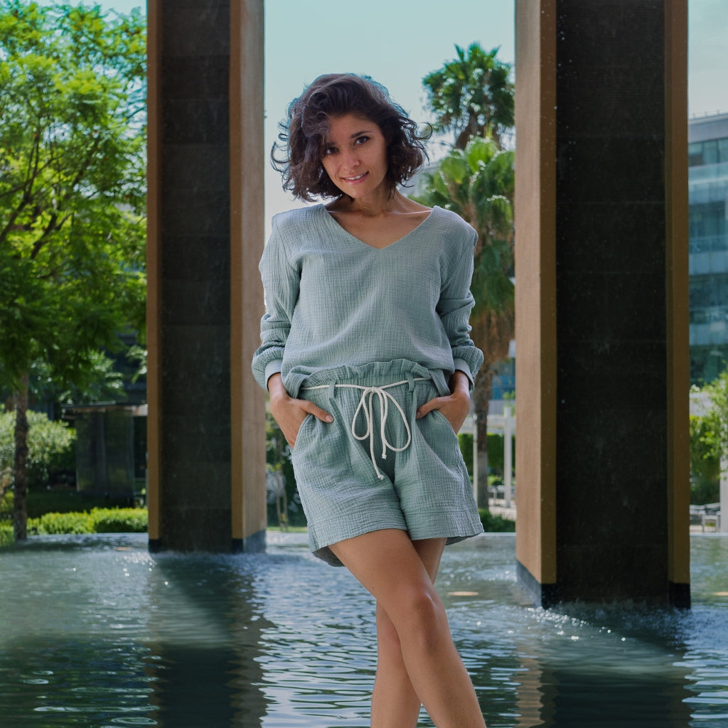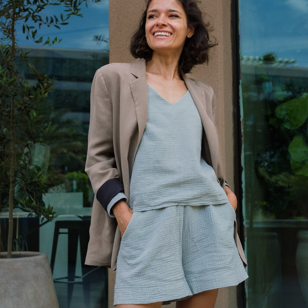 Kombiniere unsere Shorts mit einer unserer Musselin-Blusen und sofort hast du ein stylishes Musselin-Outfit.