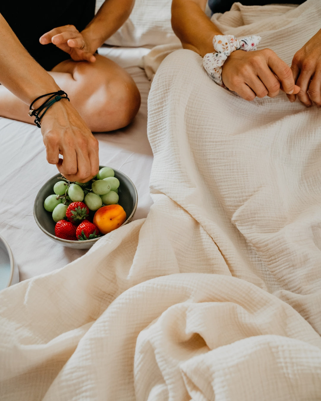 Durch die Double-Gauze-Verarbeitung unserer Stoffe kann die Luft einfacher zirkulieren, was für eine angenehme Luftdurchlässigkeit sorgt!
