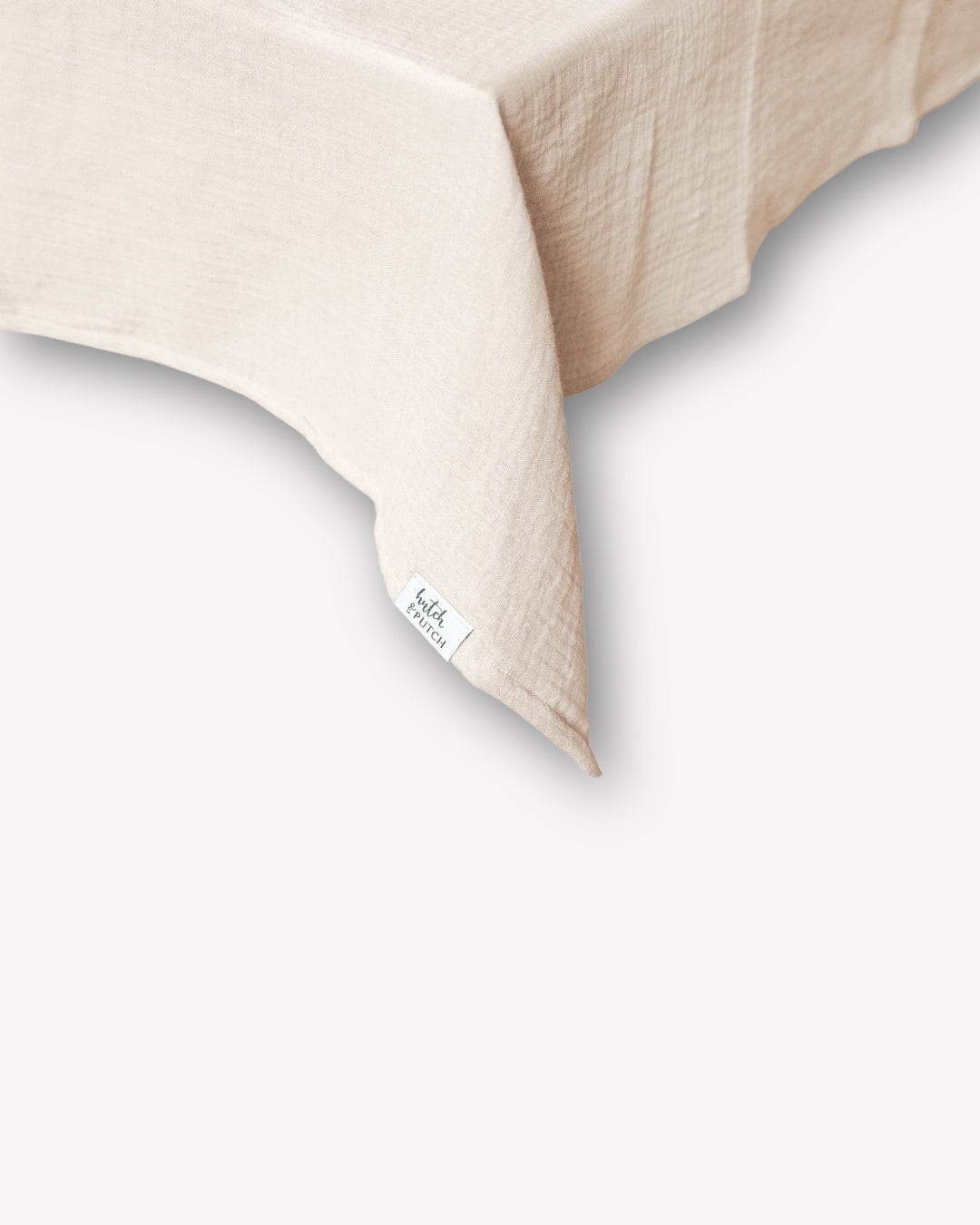 Tischlein deck dich! Unsere Musselin-Tischdecke in dezentem Beige ist ein Garant für einen stilvoll gedeckten Tisch – egal ob beim Mittagessen mit der Familie oder beim Abendessen mit Freunden.