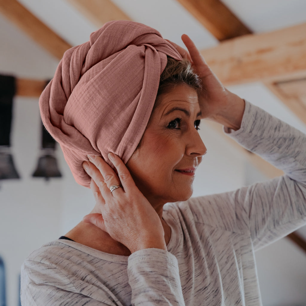 Wusstest Du, dass die raue Struktur von Frottee für die nassen Haare gar nicht gut ist? Für schonendes Trocknen der Haare haben wir deswegen einen Musselin-Turban entworfen, der nicht nur kuschelweich, sondern auch richtig stylisch ist!