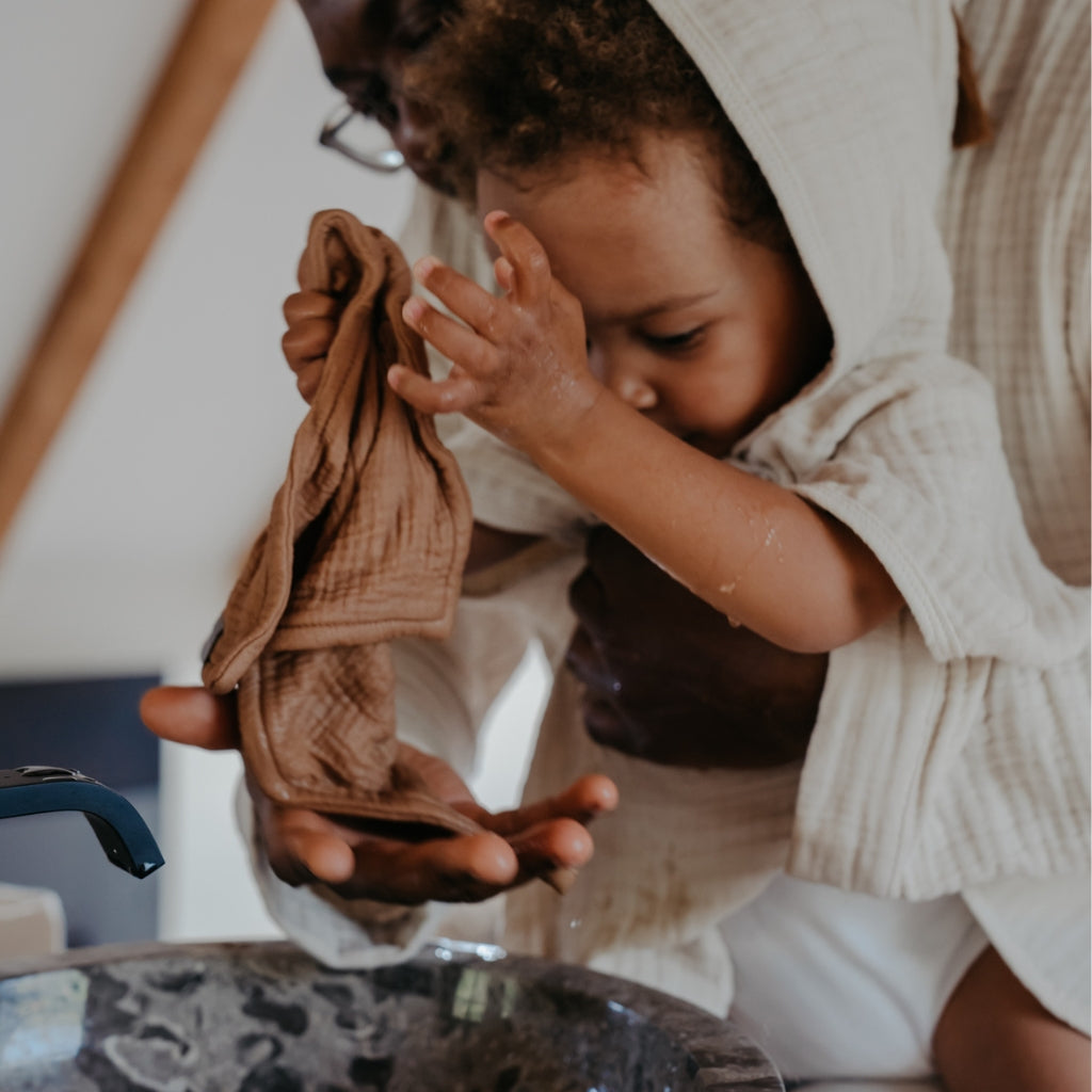 Unser Turban und unserer Waschlappen sind aus 100% Bio-Baumwolle gefertigt und somit auch für zarte Babyhaut geeignet.