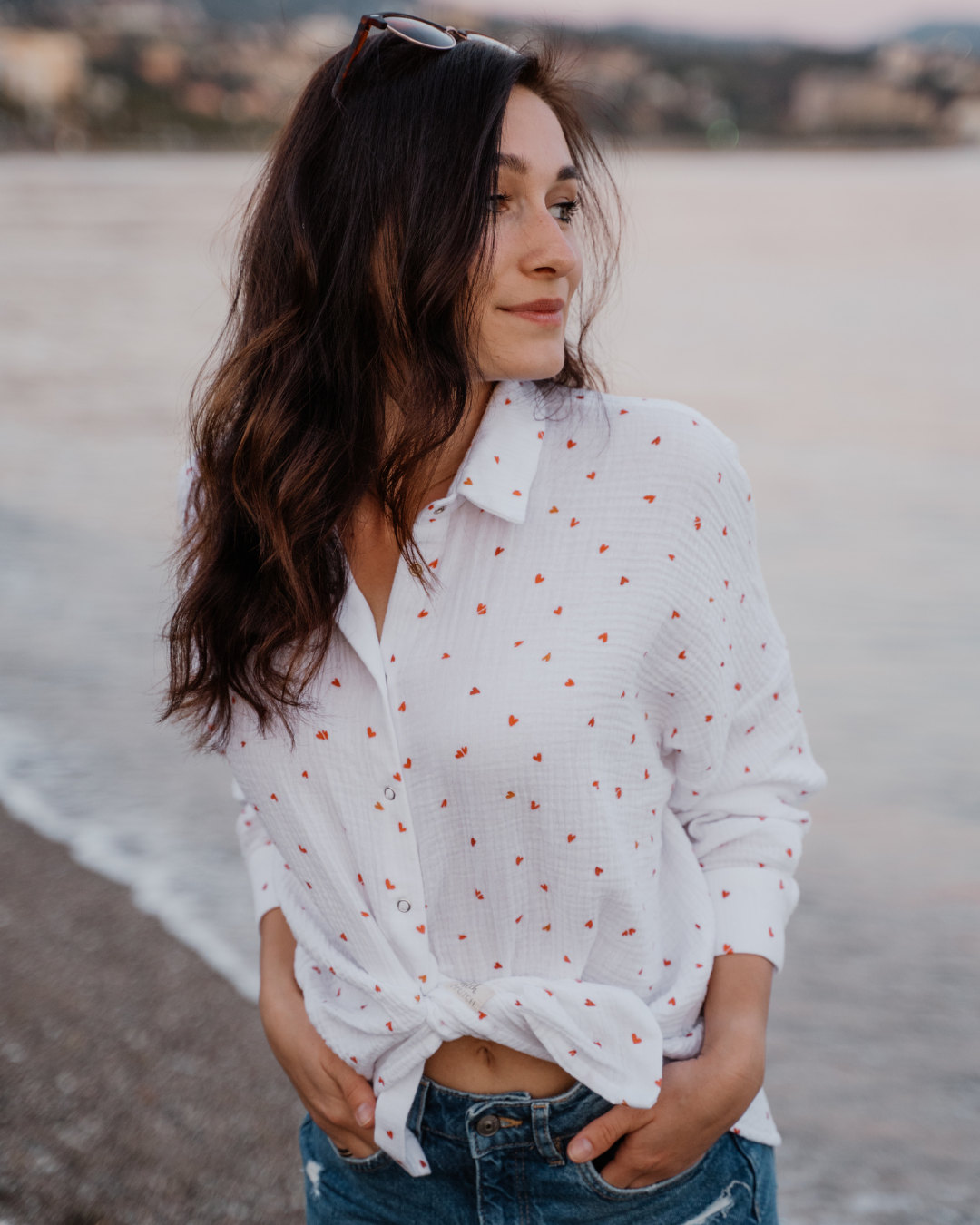 Die stundenlange Suche nach dem perfekten Outfit gehört der Vergangenheit an. Mit unserer Musselin Bluse im süßen Herzchendesign lassen wir romantische Herzen höher schlagen. Egal ob Kaffee-Date mit den Freundinnen, romantisches Dinner mit dem Partner oder Spieldate auf dem Spielplatz, die schönsten Outfits sind meist die einfachsten. Durch die temperaturausgleichende Eigenschaft des Stoffes ist unsere Musselin Bluse jahreszeitenunabhängig tragbar. Egal ob klassisch zur Jeans, sommerlich zur Shorts, sportlich mit Leggings, elegant mit Rock oder lässig über dem Kleid - die hutch&putch Musselin Bluse ist ein richtiges Allroundtalent, mit der du garantiert immer gut aussiehst!