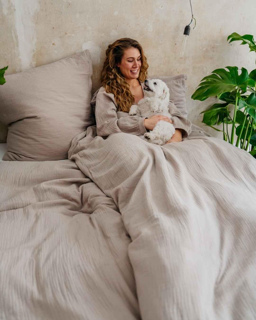 Wir lieben diese Musselin-Bettwäsche, tolles Gefühl, super weich und kuschelig sagt mein Mann jeden Morgen, hoffen auf noch andere Farbauswahl, würden immer wieder kaufen